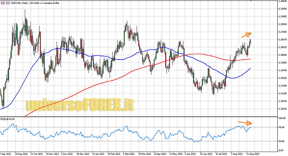 Dobbiamo aggiungere che l’indicatore RSI fa intravedere una divergenza rispetto ai prezzi, che potrebbe preannunciare un esaurimento del trend in corso. Per questo bisognerà monitorare con attenzione l’andamento dell’USDCAD nei prossimi giorni.