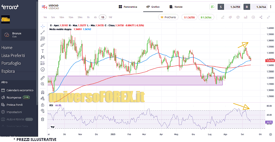Sul fronte valutario, il dollaro canadese sta recuperando quota rispetto all’USD. La divergenza tra prezzi ed RSI che si è creata settimana scorsa ha preannunciato efficacemente un impulso ribassista.