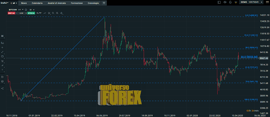 Il prezzo ha violato il 50 Fibonacci (costruito sul movimento tra fine 2018 e metà 2019), ma poi è stato rispinto verso questo livello verso gli 8600, dove si sta consolidando (fonte grafica broker ).