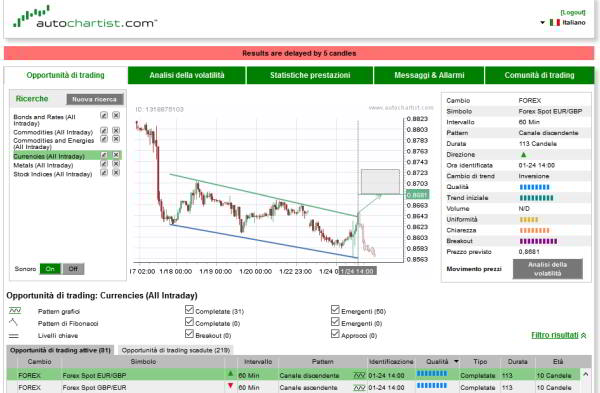 Oltre a identificare il pattern ci fornisce una previsione sulle probabilità di completamento del pattern stesso, indicando quindi la qualità del segnale. Inoltre aiuta i trader a impostare gli stop e i limiti identificando i livelli di supporto e resistenza. Ecco come si presenta: