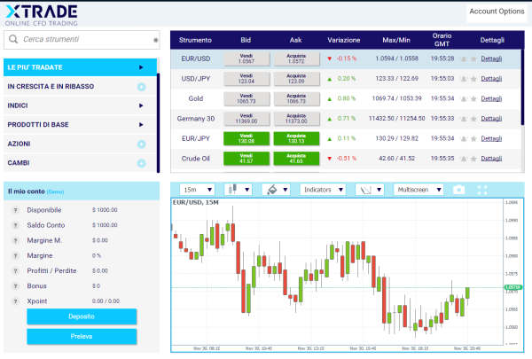 Scegliendo Xtrade si può avere accesso ad un ambiente di trading molto esaustivo. Si possono infatti fare operazioni CFD sulla più ampia gamma disponibile di asset sottostanti: azioni, cambi, commodity e moltissimi indici.