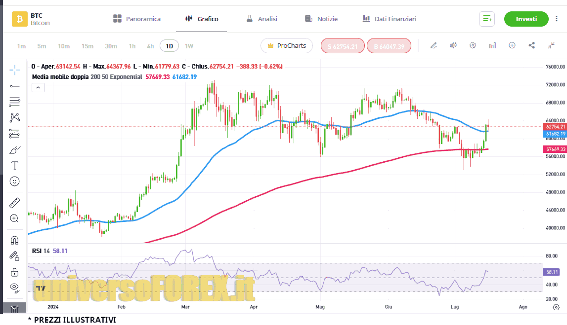 L’evoluzione degli ultimi giorni ha consentito al di oltrepassare l’importante livello di resistenza a 63.000 dollari, come vediamo nell’immagine sulla piattaforma di investimento , ma soprattutto ha consentito al prezzo di tagliare la rialzo la Ema200 e presentarsi così al test della Ema50.