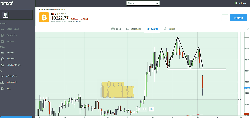 Il crollo di conferma che la zona compresa tra 12.000$ e 12.500$ è un forte range di resistenza. Il prezzo è tornato con forza verso il Fibonacci 61.8 (costruito sul movimenti tra la fine del 2018 e metà 2019) e ha appena infranto un pattern head and shoulders (fonte grafica ).