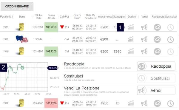Quando apri una posizione infatti, puoi monitorare la sua evoluzione e sfruttare tre strumenti molto interessanti: Raddoppiare, Prolungare e vendere.