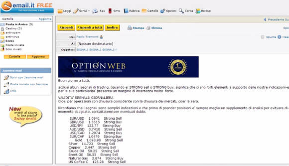Sempre nell’ottica di permettere ai propri trader un’esperienza completa e redditizia, OptionWeb fornisce anche segnali di trading. Si tratta di indicazioni di investimento che vengono quotidianamente fornite ai clienti in varie modalità. Per avere accesso ai segnali operativi di trading occorre essere titolare almeno di un contro “silver”.