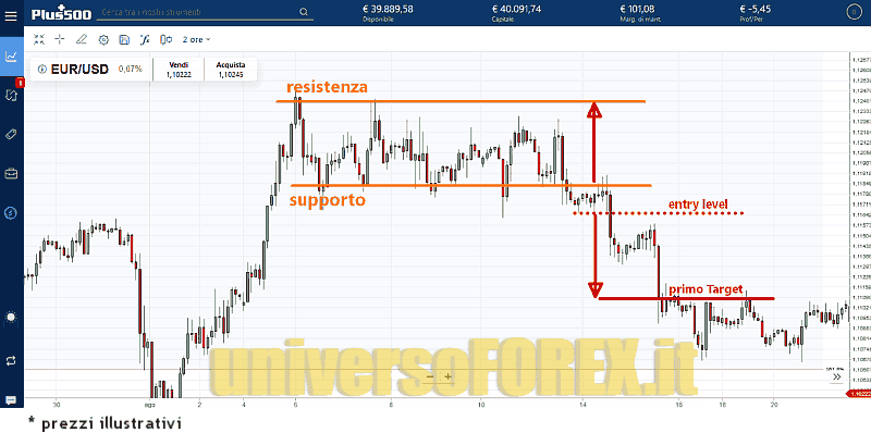 Riguardo invece al TARGET DI PROFITTO, non c’è una regola ne’ una prescrizione precisa. Si potrebbe ad esempio fissare un primo obiettivo proiettando l’altezza del range a partire dal punto di ingresso a mercato, come ti mostriamo sulla piattaforma .