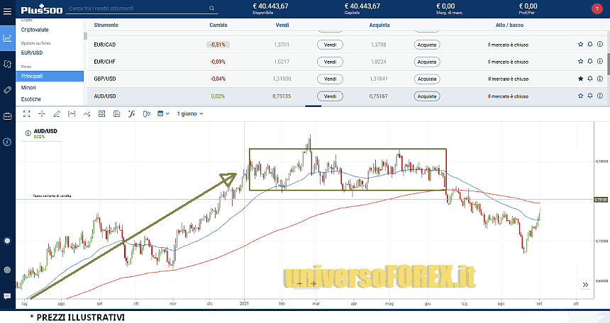 Durante questa fase laterale di mercato, che sul grafico di abbiamo evidenziato con un rettangolo, la spinta di chi compra è uguale a quella di chi vende. Per questo motivo il prezzo oscilla all’interno della fascia, senza indirizzarsi con decisione verso un rialzo o verso il ribasso.