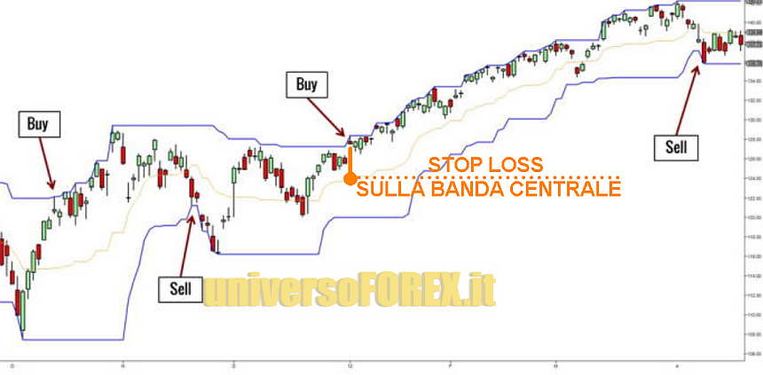 Quindi lo STOP LOSS va fissato sulla linea centrale, in corrispondenza del prezzo al quale facciamo ingresso a mercato.