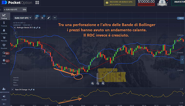 Può cioè accadere che mentre gli sforamenti delle Bande di Bollinger procedano in seno rialzista, il ROC invece presenti un andamento ribassista.