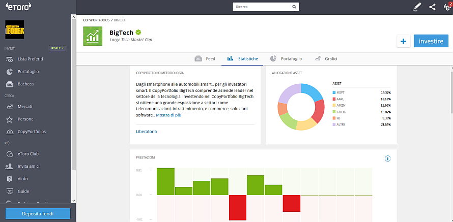 Per ogni singolo è possibile avere delle informazioni accurate: il profilo di rischio associato, una breve descrizione del Portfolio (nell’immagine è sui titoli delle aziende “Big Tech” come Google, Amazon, Facebook, ecc) la composizione del Portfolio, qual è stata la remunerazione degli ultimi 12 mesi, un grafico che evidenza l’andamento mese dopo mese.