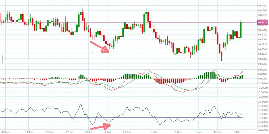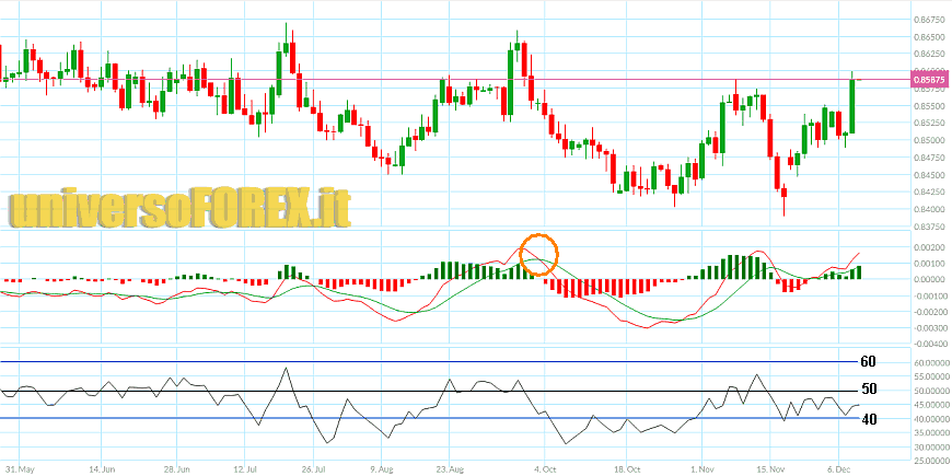 Abbiamo cerchiato un punto in cui l’indicatore MACD ci manda un segnale di vendita e contemporaneamente l’indicatore Relative Volatility Index è >50: questo rafforza il segnale di vendita.