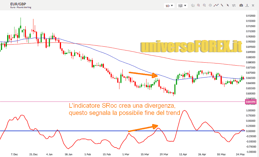 Infatti come vediamo nell’esempio sul broker , durante un trend ribassista si genera una divergenza tra i prezzi che vanno in discesa e l’S-ROC che invece vira al rialzo. Questo ci allerta riguardo la possibile fine del trend.