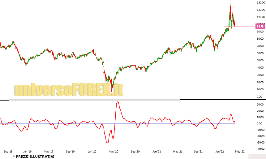 Il risultato sarà una percentuale che viene rappresentata sul grafico come una linea oscillante che IN TEORIA può ondeggiare tra -100% e +100%, ma IN REALTA’ difficilmente esce dal range compreso tra -30% e +30%.