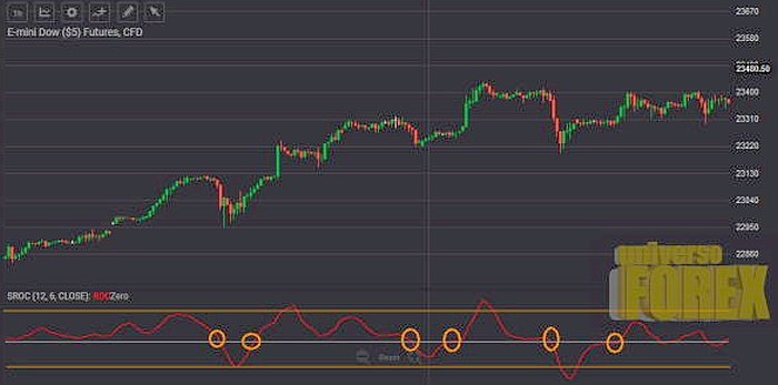 Come puoi vedere nell’immagine su , effettivamente l’indicatore S-Roc ondeggia poco attorno alla linea centrale, e solo in poche circostanze presenta improvvisi picchi o sbalzi (nell’immagine ce ne sono due, uno al rialzo e uno al ribasso).