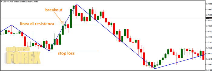 Quando poi si verifica un breakout di questi livelli, abbiamo un segnale di ingresso a mercato, come vediamo illustrato nell’immagine sul broker :